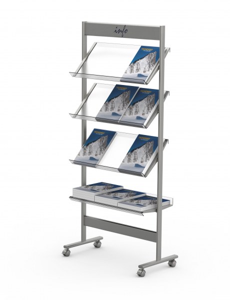 Ausführung metall, mit 4 transparenten Acrylglas-Fachböden geneigt, ideal für Messen, Präsentationen und die Reisebranche.