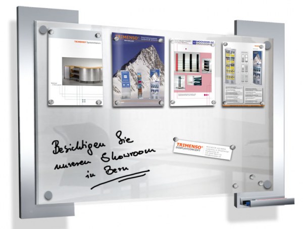Das schicke Infoboard besticht durch eine satinierte Glasplatte, die mit einer magnetischen Metallrückwand hinterlegt ist und die auch wie ein Whiteboard mit entsprechenden Markern beschrieben werden kann.